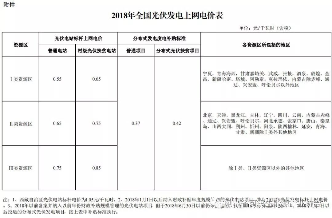一、根据当前光伏产业技术进步和成本降低情况,降低2018年1月1日之后投运的光伏电站标杆上网电价,Ⅰ类、Ⅱ类、Ⅲ类资源区标杆上网电价分别调整为每千瓦时0.55元、0.65元、0.75元(含税)。自2019年起,纳入财政补贴年度规模管理的光伏发电项目全部按投运时间执行对应的标杆电价。